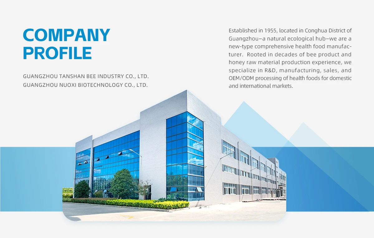 Guangzhou Nuoxi Biotechnology Co., Ltd. is a subsidiary of Guangzhou Tanshan Beekeeping Co., Ltd. It has over 60 years of experience in the deep processing of honey, gaozhi (traditional Chinese medicinal paste), powder, liquid beverages, jelly, tablets, an
